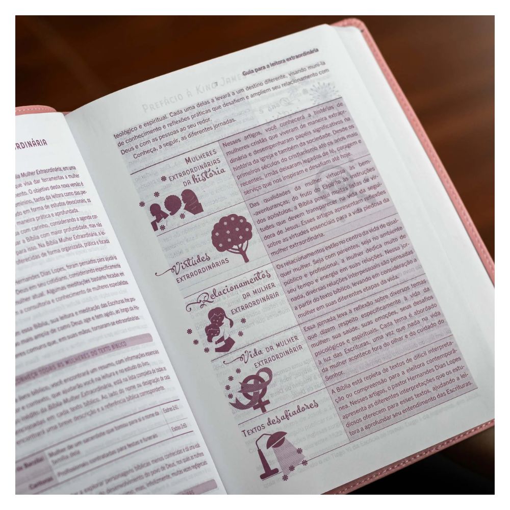 Bíblia Mulher Extraordinária foi cuidadosamente preparada para ser uma companhia fiel na caminhada da mulher cristã com Deus. Pensada para atender às necessidades específicas da mulher de hoje, ela oferece recursos práticos para estudo, meditação e oração, conectando a vida cotidiana à Palavra de Deus.